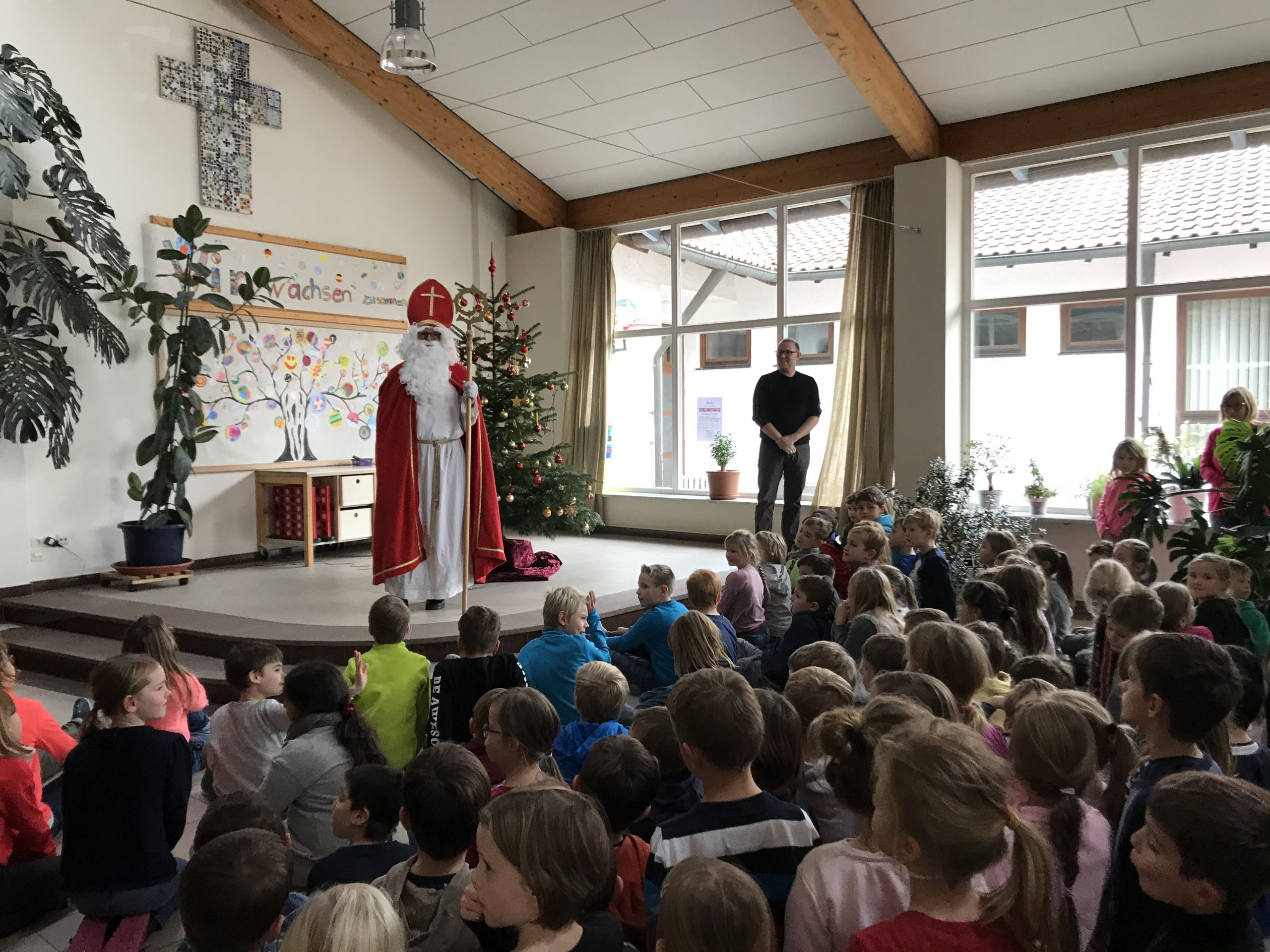 Letztendlich war der Nikolaus der Meinung, dass doch alle recht brav waren und so konnten sich alle Schülerinnen und Schüler über eine süße Überraschung freuen. Der Nikolaus holte anschließend nochmal alle Kinder in der Aula zusammen, um ihnen sein besonderes Zuckerl zu präsentieren (herzlichen Dank an den Elternbeirat). Nämlich das Mitmachsingspiel „David, der Hirtenjunge“ der Gruppe Shalom, welches am 17. Dezember um 11 Uhr in der Turnhalle der Grundschule stattfindet. Die Kinder schlüpfen dabei in die Rolle richtiger Musicaldarsteller. Eltern, Großeltern oder Geschwister sind zur Aufführung herzlich eingeladen!