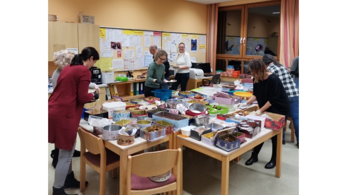 Stolz brachten die Schüler ab Donnerstag, 17.11. schöne und lecker gefüllte Weihnachtsdosen mit Plätzchen in die Schule. Diese wurden in einem extra gekühlten Raum gelagert, der sich die Folgetage immer mehr füllte. Am Ende standen rund 100 Plätzchendosen mit den unterschiedlichsten Sorten auf den Tischen.