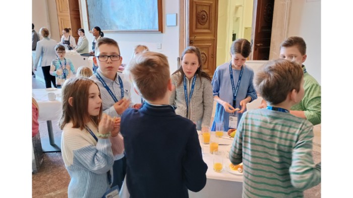 Nach einem ausgiebigen Mittagessen, durften alle Schüler in den Plenarsaal und der Autorin und dem Illustrator Fragen stellen. Interessant war dies auch dadurch, weil die Schüler auf den Abgeordnetenstühlen saßen und deren Technik, wie das Mikrofon selbst bedienen durften. Zur Freude aller gab es einen Rucksack mit kleinen Utensilien aus dem Landtag und zu den Isar-Detektiven, insbesondere aber dem vierten Band der Isar-Detektive als Geschenk für jedes Kind. Das Buch ließen sich die meisten dann gleich vor Ort von Frau Janotta und Herrn Leuchtenberg signieren.